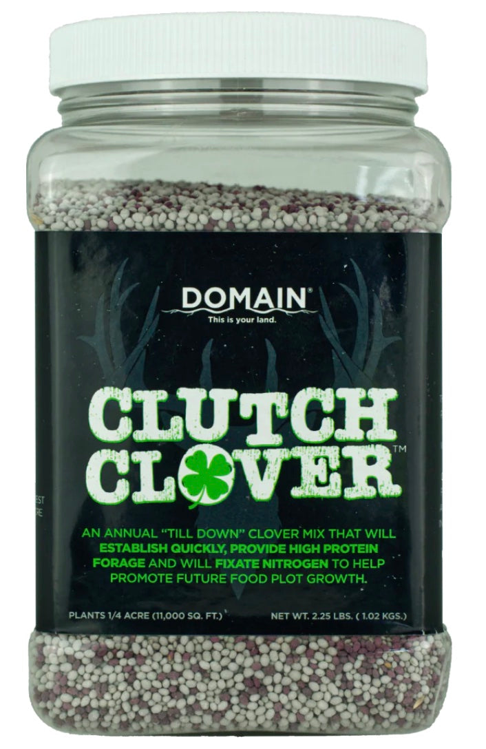 CLUTCH CLOVER IS A UNIQUE COMBINATION OF 3 SPECIAL VARIETIES OF ANNUAL CLOVER DESIGNED TO ESTABLISH QUICKLY AND PROVIDE A QUICK PROTEIN SOURCE TO HANDLE BROWSE PRESSURE WHILE BUILDING UP BIOMASS. DUE TO ITS QUICK, LUSH GROWTH, CLUTCH CLOVER WILL QUICKLY BECOME A FAVORITE LOCATION FOR SPRING, SUMMER, AND EARLY FALL FEEDING DUE TO THE YOUNG TENDER PLANTS THAT PRODUCE TONS OF BIOMASS AND PROTEIN. IN ADDITION TO THE FORAGE PRODUCTION, CLUTCH CLOVER IS AN IDEAL “TILL DOWN” OPTION FOR PLOT ROTATIONS, AS IT FIXATES NITROGEN AND ADDS THAT BACK TO THE SOIL FOR FUTURE FOOD PLOT PLANTING. CLUTCH CLOVER CAN BE PLANTED ON ITS OWN, MIXED WITH LONG-LASTING PERENNIALS AS A DUAL CROP, OR COMBINED WITH BRASSICAS IN THE FALL TO OFFER A GREAT SPRING GREEN UP AND SOIL FIXER. AS AN ANNUAL TILL DOWN MIX, CLUTCH CLOVER OFFERS A VERSATILE FOOD PLOT OPTION PERFECT FOR LOW MAINTENANCE, MINIMUM TILL BACKWOODS PLOTS OR AS A ROTATIONAL CROP IN YOUR LARGE DESTINATION FOOD PLOTS.