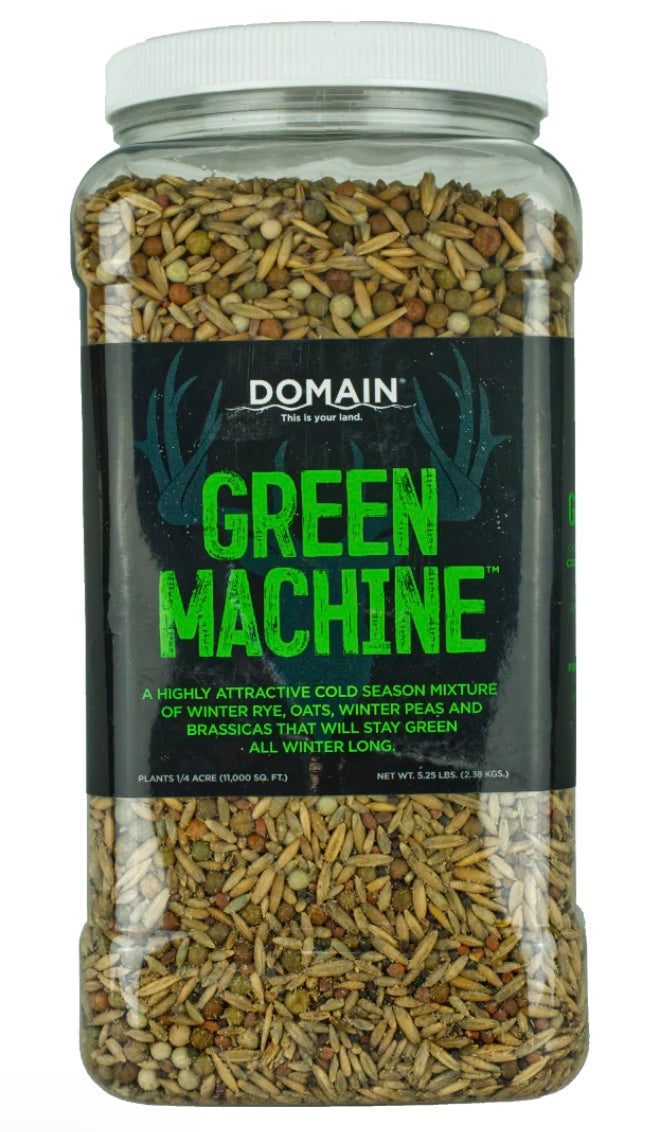 GREEN MACHINE IS A HIGHLY ATTRACTIVE COLD WEATHER FOOD SOURCE THAT WILL REMAIN GREEN THROUGHOUT THE WINTER, MAKING IT THE PERFECT FALL AND WINTER FOOD PLOT TO FEED YOUR HERD. GREEN MACHINE CONTAINS VARIETIES OF WINTER RYE, FORAGE OATS, WINTER PEAS, FORAGE RAPE AND TILLAGE RADISH. THESE PLANT VARIETIES HAVE BEEN SPECIFICALLY CHOSEN FOR THEIR PH TOLERANCE, ABILITY TO GERMINATE QUICKLY, COLD WEATHER TOLERANCE AND ABILITY TO ATTRACT MORE DEER. BECAUSE GREEN MACHINE GERMINATES QUICKLY, STAYS GREEN INTO THE WINTER AND IS EASY TO ESTABLISH IT’S A VERY POPULAR MIX TO BROADCAST INTO STANDING BEANS IN THE EARLY FALL. SINCE GREEN MACHINE CAN HANDLE GRAZE PRESSURE WELL, IT PROVIDES A GREAT OPTION FOR SMALL HUNT PLOTS IN BETWEEN AG FIELDS AND BEDDING OR AS YOUR MAIN DESTINATION FOOD SOURCE. WHEN DEER SEASON SETS IN, YOU’LL BE GLAD YOU HAVE GREEN MACHINE ON YOUR PROPERTY.
