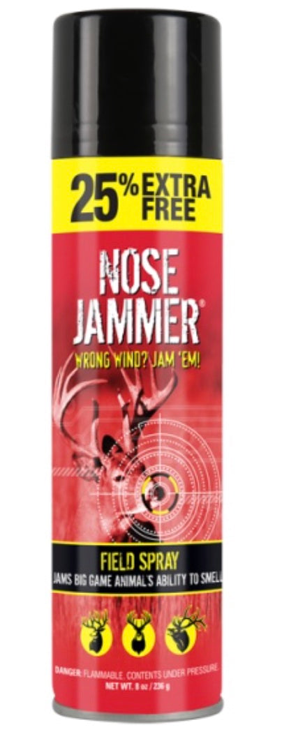 Nose Jammer creates a cloud around you which jams big game's ability to detect and track human odor. Nose Jammer should be sprayed on clothes, boots, tree stands, blinds and brush. When the wind swirls, critters olfactory gets jammed and they stay unalarmed. Nose Jammer Field spray is most effective when used in conjunction with the rest of the Nose Jammer line of products. Works on all critters with a nose!